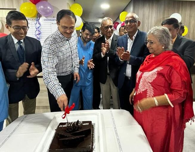Mr Debashis Dhar, Sr VP & Chief Business Development, ILS Hospitals, Dr Jayanta Mukherjee, HOD – Gastroenterology, ILS Hospitals Saltlake, Dr Om Tantia, HOD – General & Laparoscopic Surgery, ILS Hospitals Saltlake, Managing Director & Founder, ILS Hospitals, Dr Ghanshyam Goyal, HOD – Diabetology & Endocrinology, ILS Hospitals Saltlake, and Dr Aruna Tantia, HOD – Obstetrics & Minimally Invasive Gynaecology, ILS Hospitals Saltlake relaunching the Gastroenterology segment at ILS Hospitals Saltlake.