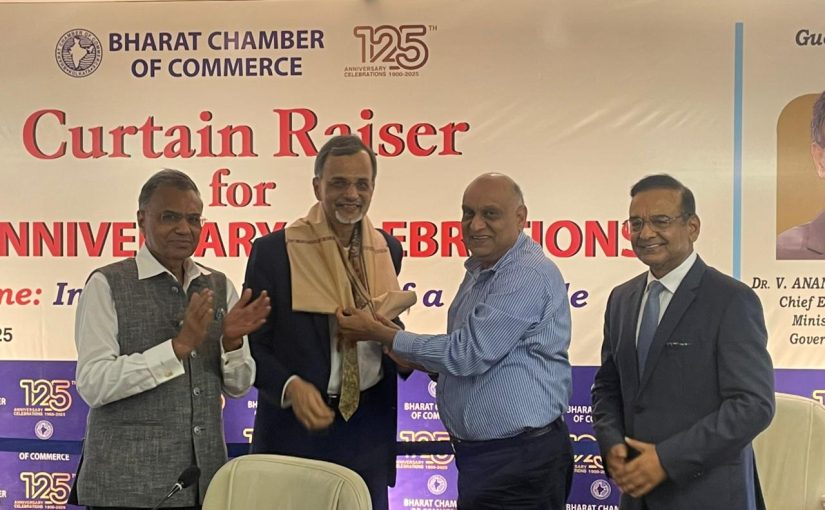 Mr N G Khaitan, Chairman, 125th Anniversary Celebrations of Bharat Chamber of Commerce, Dr. V. Anantha Nageswaran, Chief Economic Advisor, Ministry of Finance, Government of India, Mr H M Bangur, Chief Patron, 125th Anniversary Celebrations, Bharat Chamber of Commerce at the exclusive session on ‘India: The Making of Miracle’ organised by Bharat Chamber of Commerce.